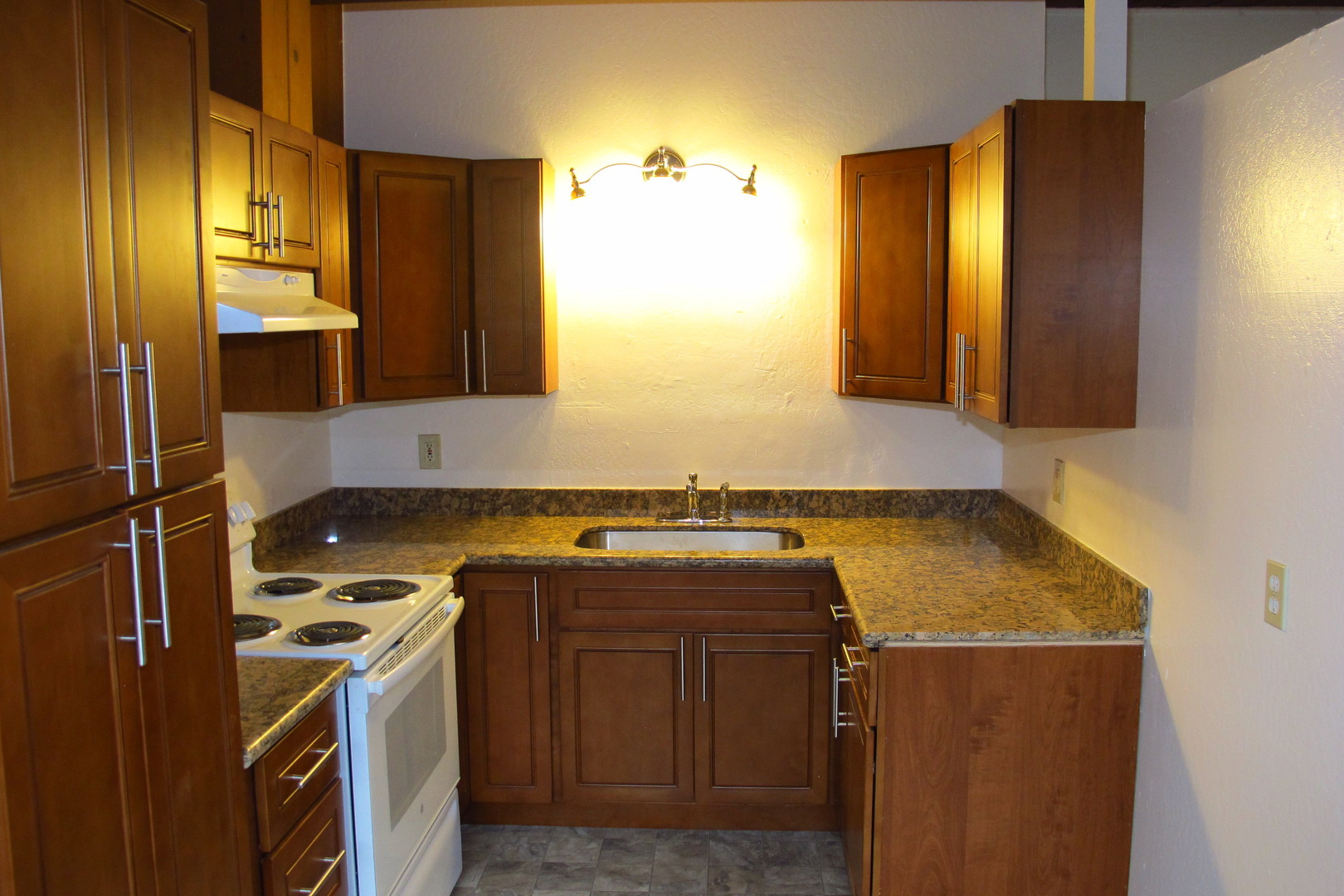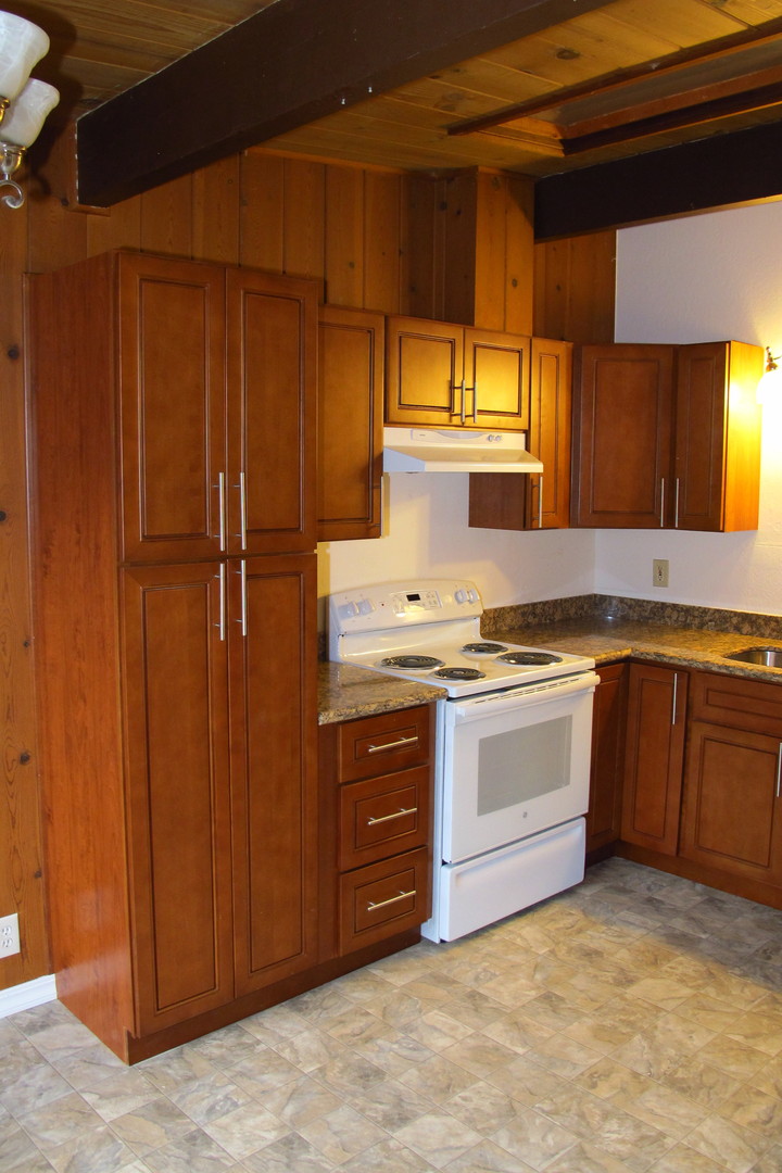 The beautifully updated kitchen features vinyl flooring and custom cabinetry, granite countertops, and refrigerator and range.