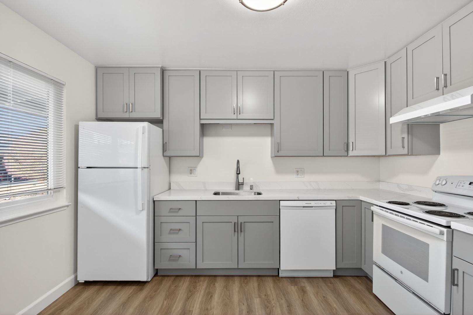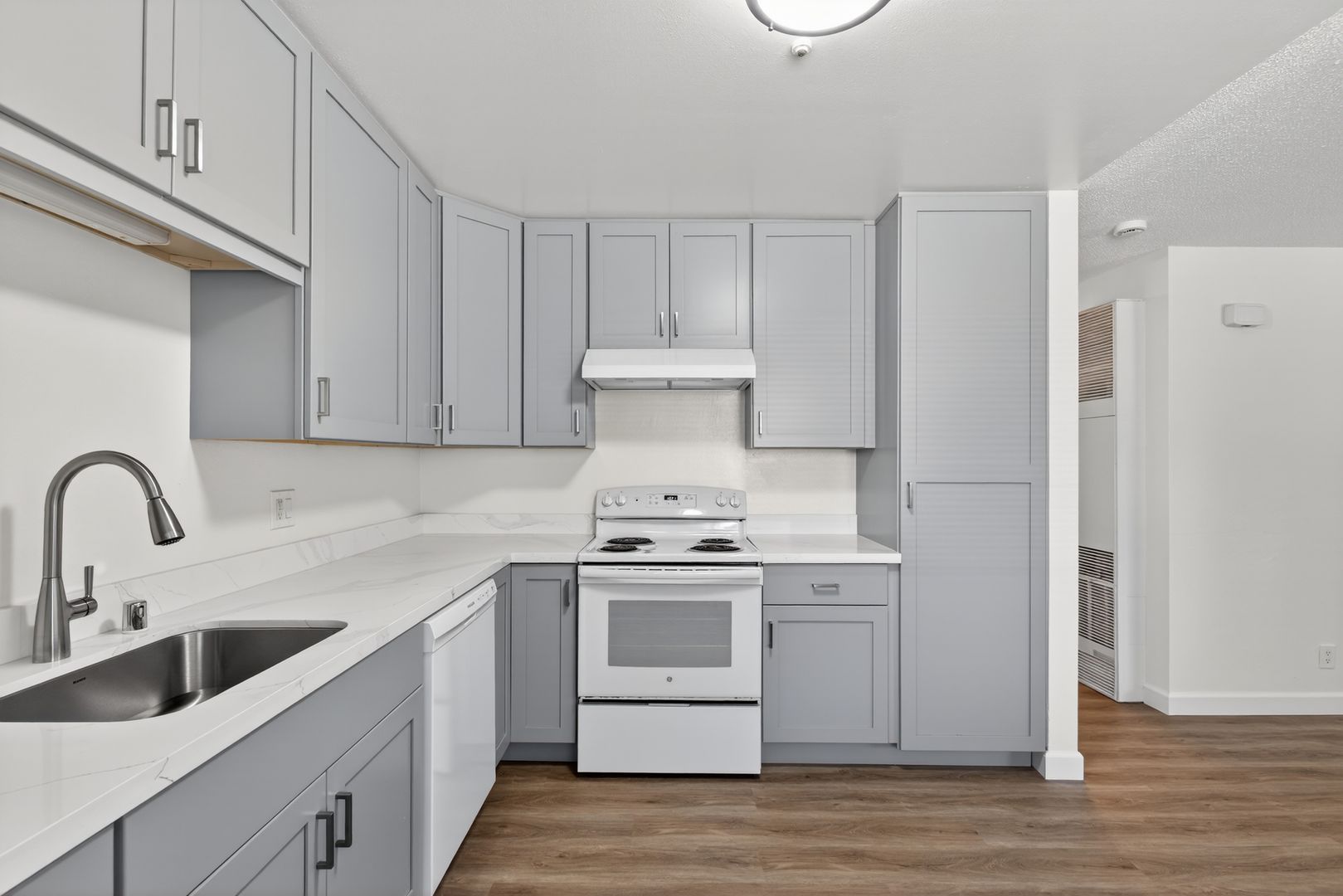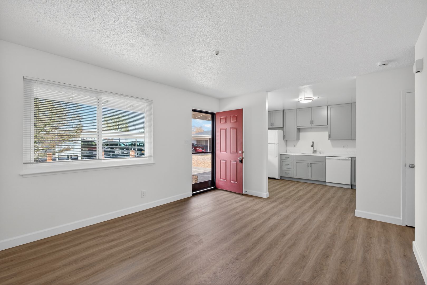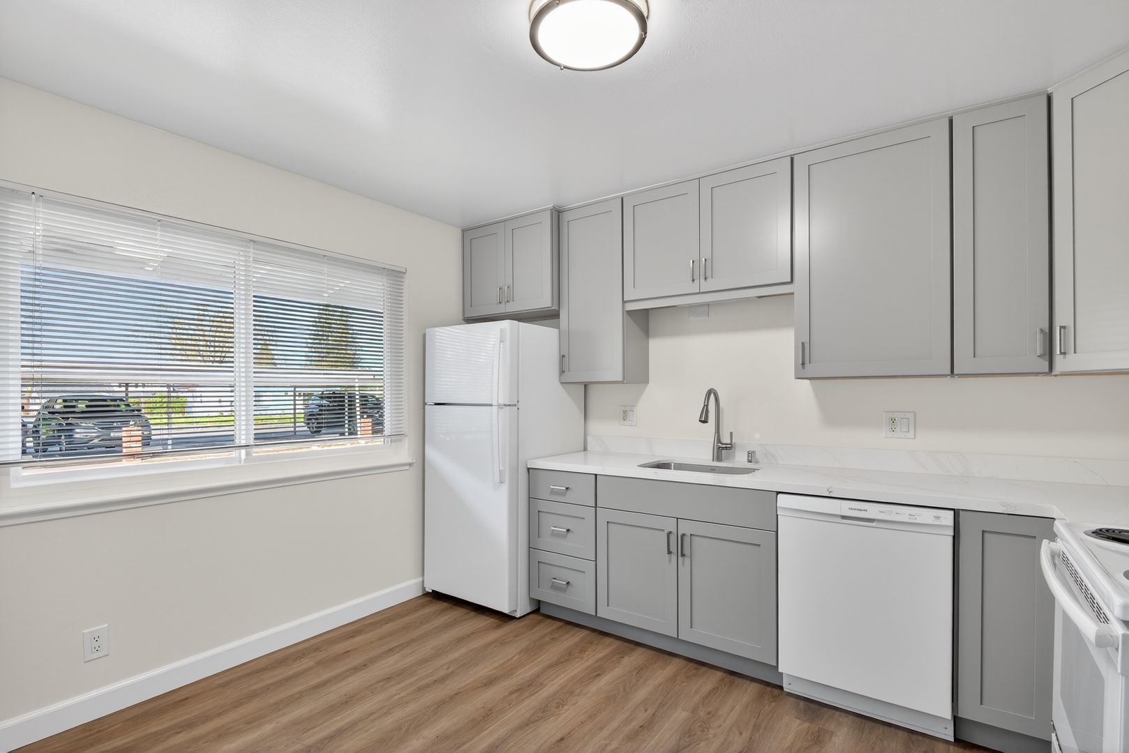 The apartment features a spacious layout with updates throughout. The kitchen has been upgraded with gray shaker cabinets, quartz countertops, and luxury vinyl plank flooring, and includes a dishwasher, refrigerator, and range. The living and dining areas are open and comfortable, making the unit easy to settle into.