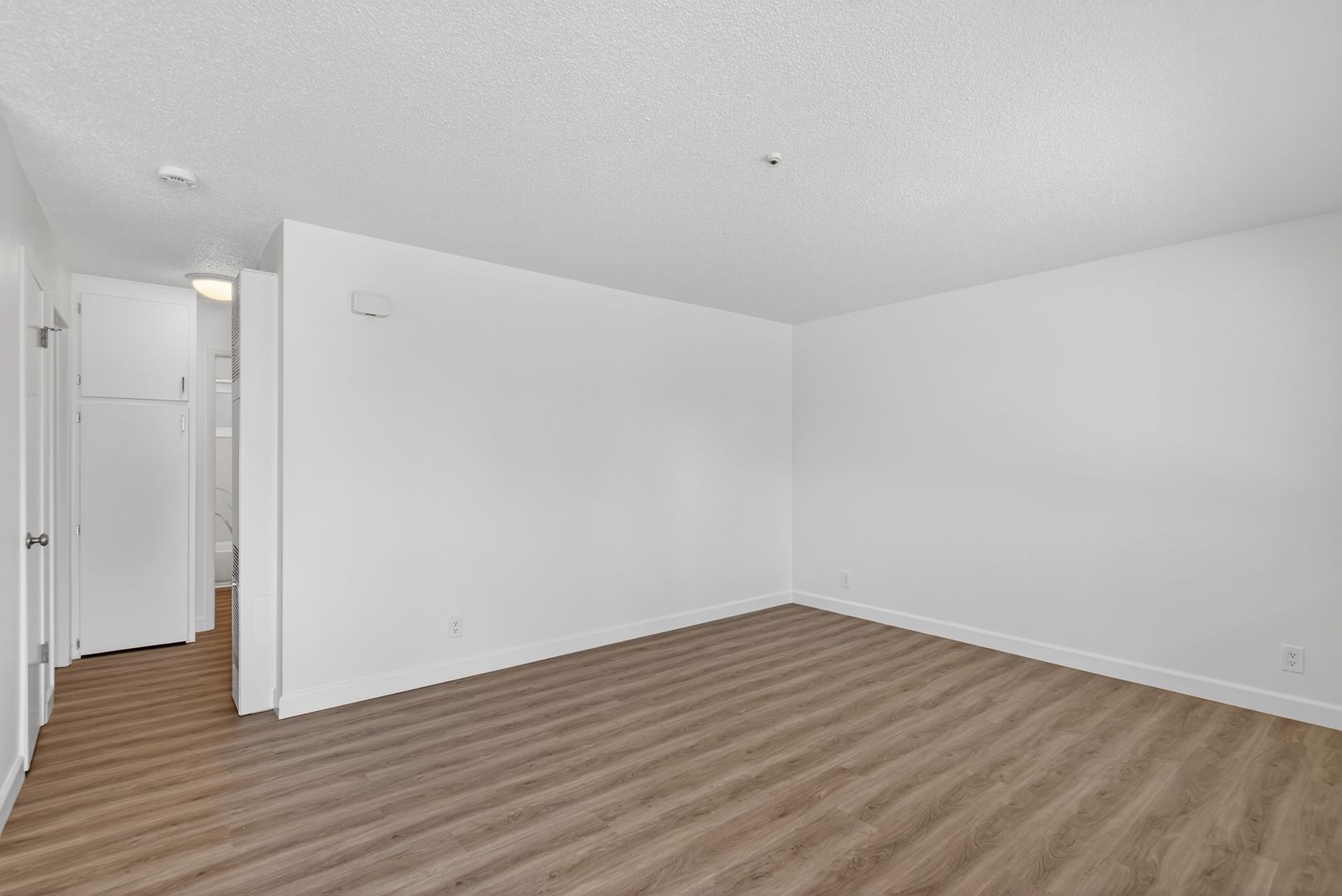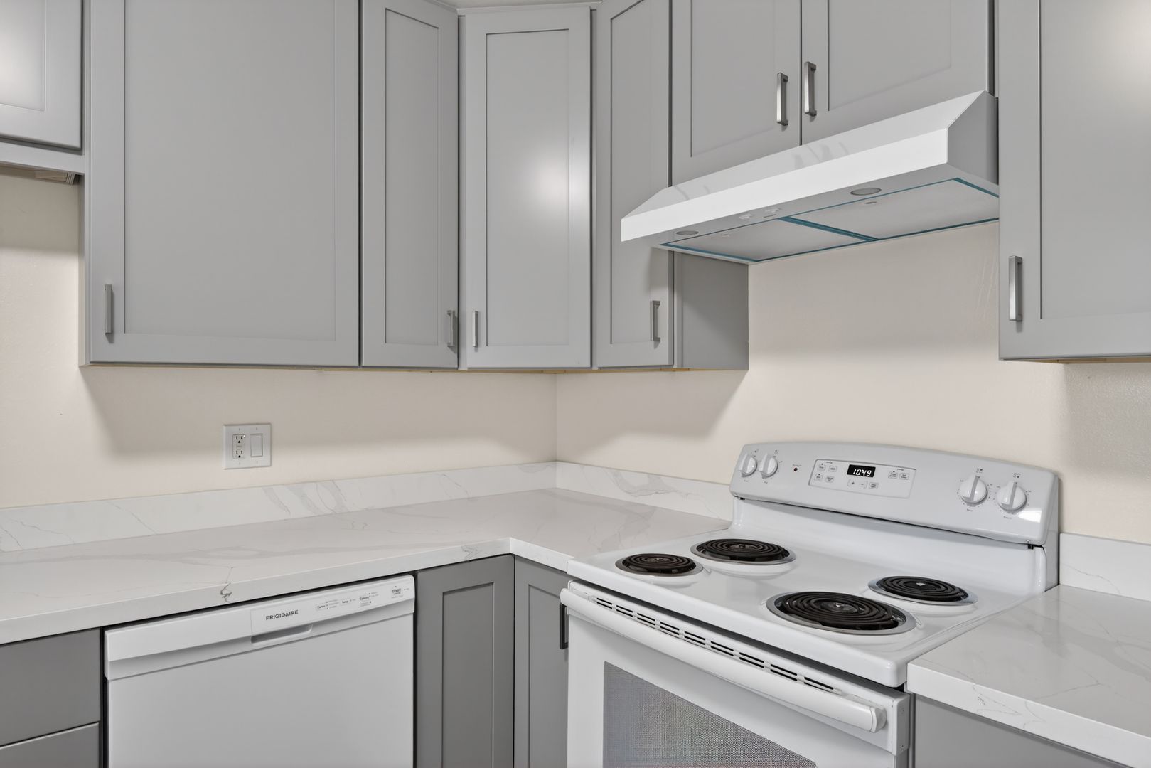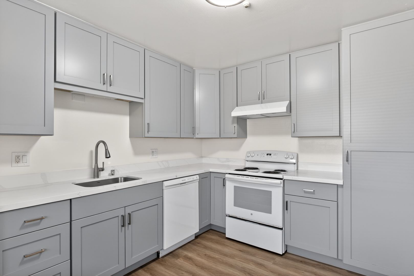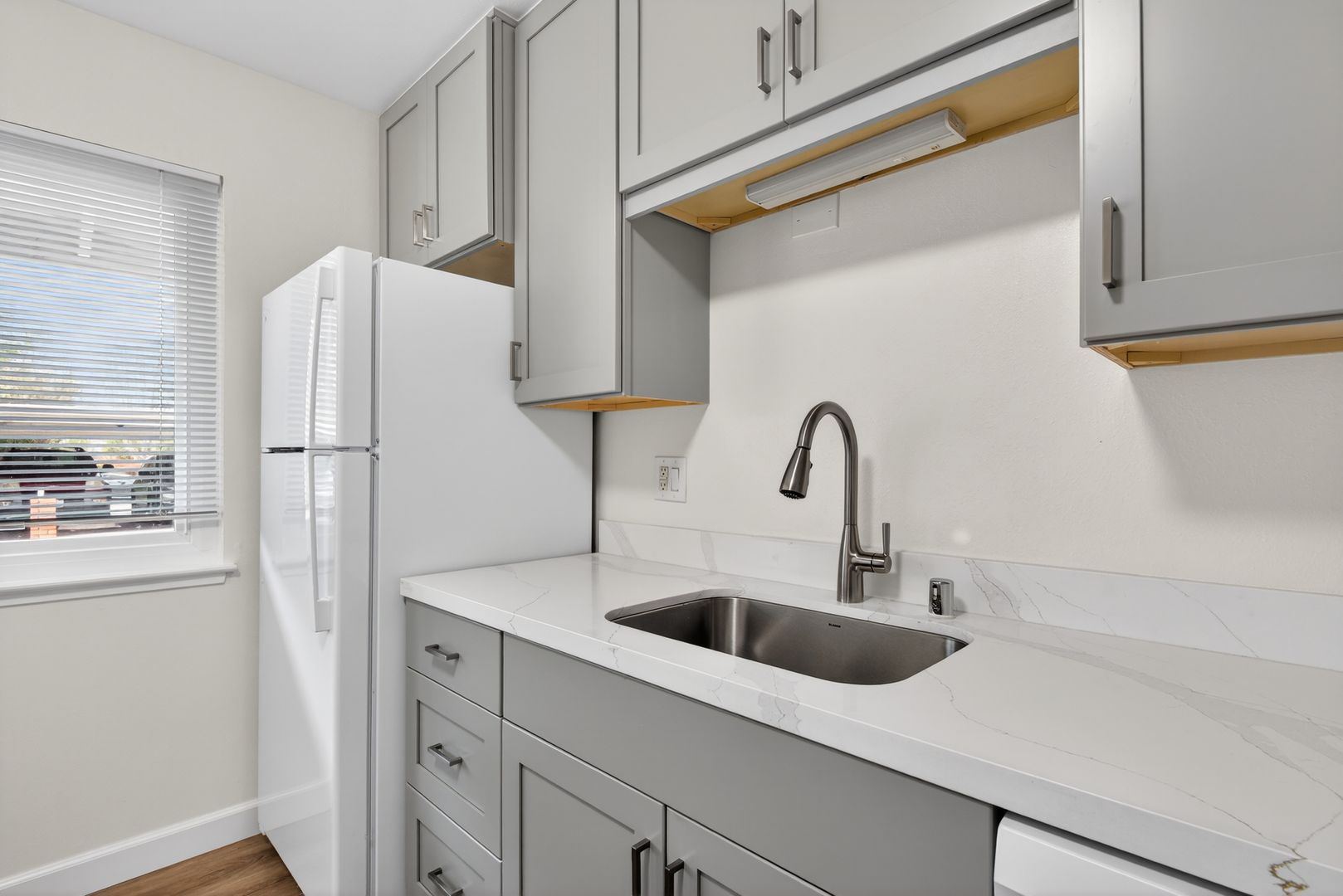 The apartment features a spacious layout with updates throughout. The kitchen has been upgraded with gray shaker cabinets, quartz countertops, and luxury vinyl plank flooring, and includes a dishwasher, refrigerator, and range. The living and dining areas are open and comfortable, making the unit easy to settle into.