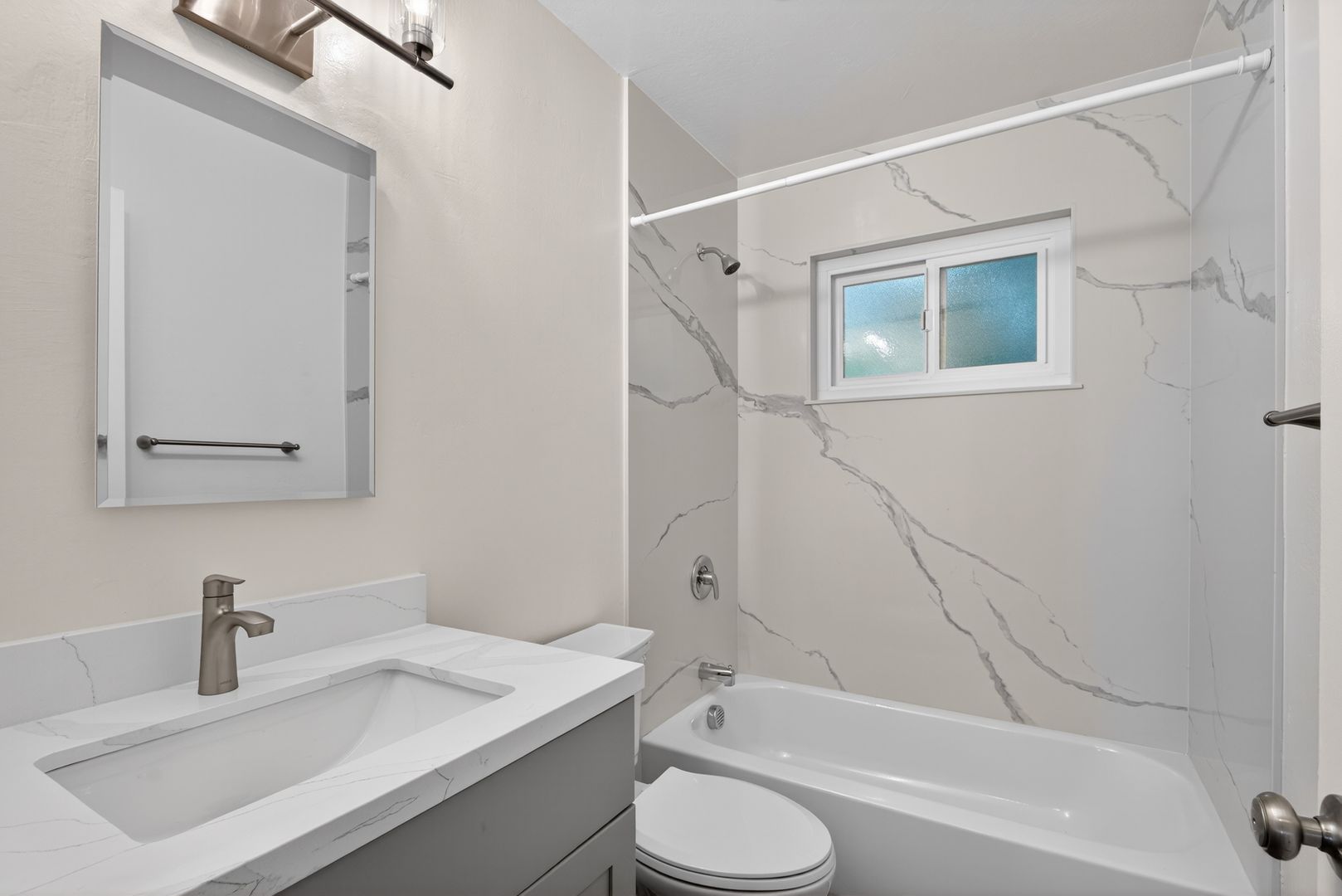 The bathroom has been tastefully remodeled and includes a quartz tub/shower surround, new vanity, and contemporary finishes.