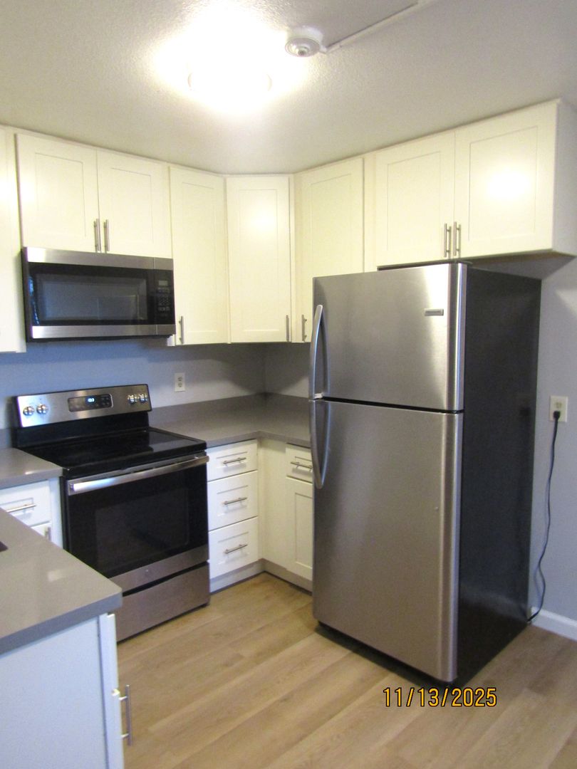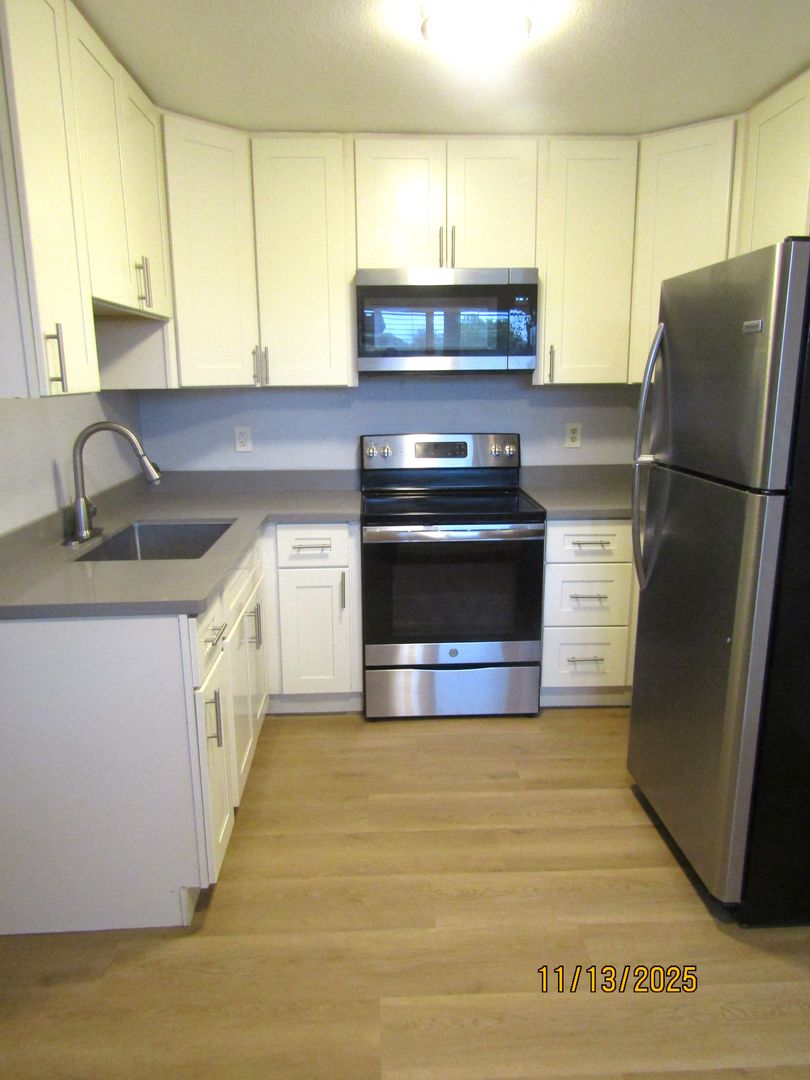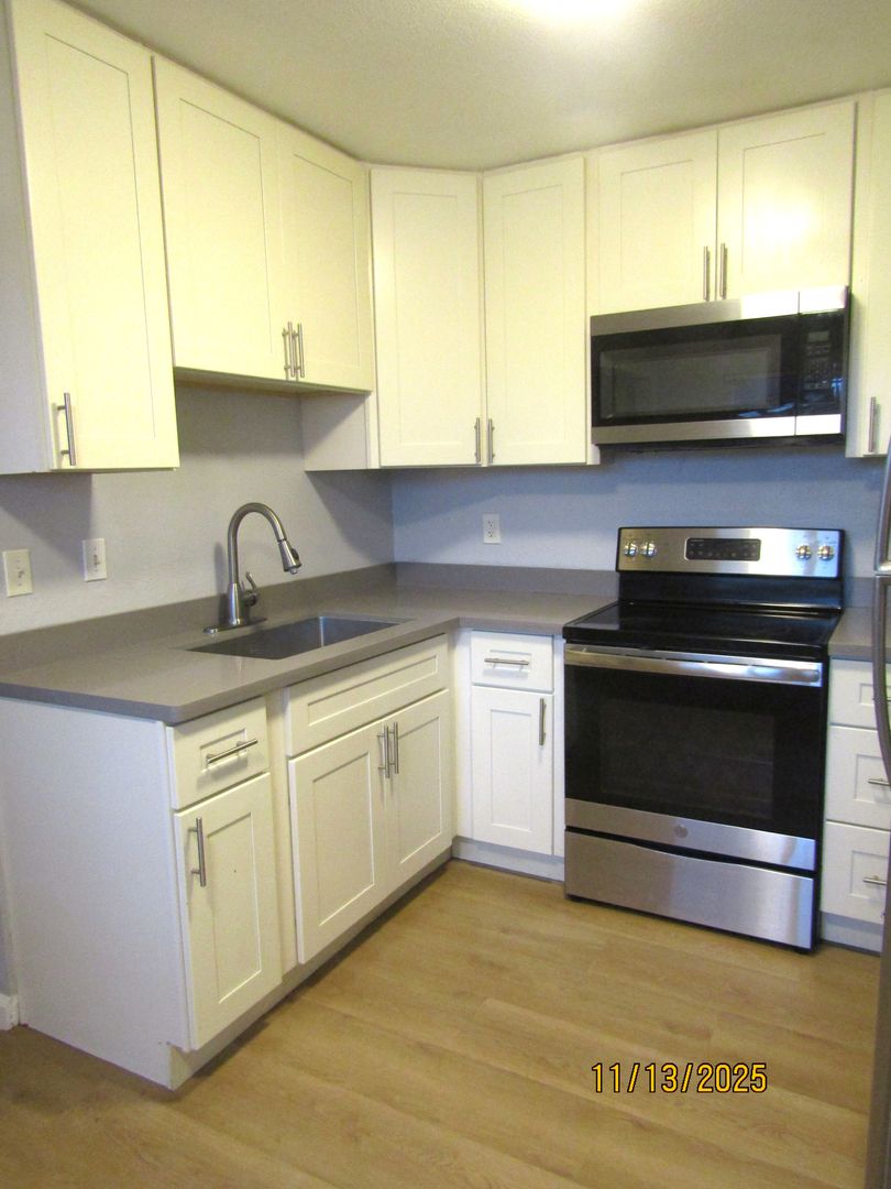 Downstairs apartment in a small complex located in North Eastern Santa Rosa; close to parks, schools, freeway access and walking distance to Whole Foods Market. This unit features new laminate flooring throughout the living areas. The updated kitchen provides lots of cabinet space; stainless steel electric cooktop; microwave and refrigerator. Nice sized bedroom situated in the back of the unit. The bathroom has tile flooring, a large vanity with plenty of counter space, shower/tub combo and good closet storage. One assigned parking space provided; shared onsite laundry in complex.