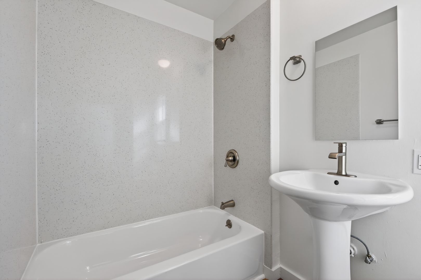 Brand-new bathroom update with quartz tub surround