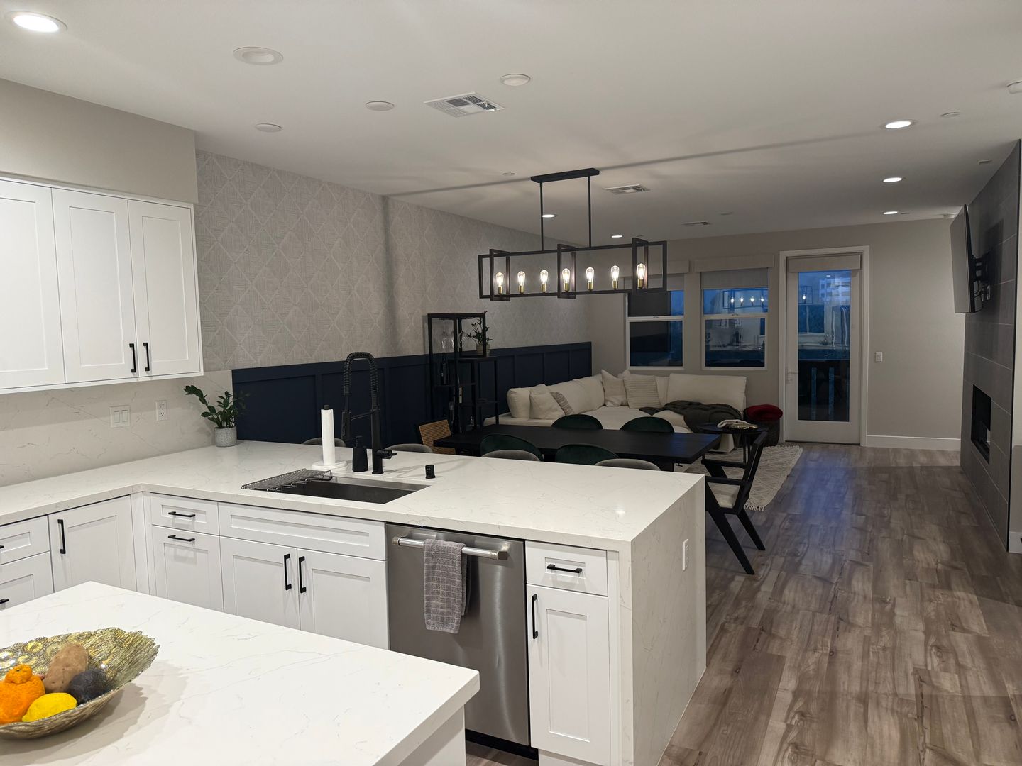 - Quartz countertops with waterfall island.